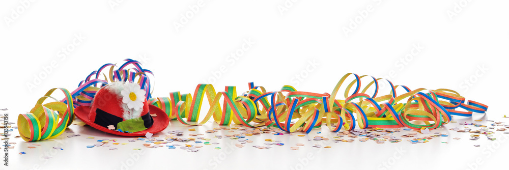 Fototapete Luftschlangen Konfetti Und Karnevalshut Vor Weissem Hintergrund Panorama V Poth