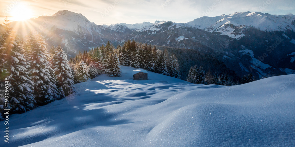 Schihutte Mit Weihnachtsbaum Bei Schnee Fototapete Fototapeten Winterlich Winterlandschaft Winterlich Myloview De