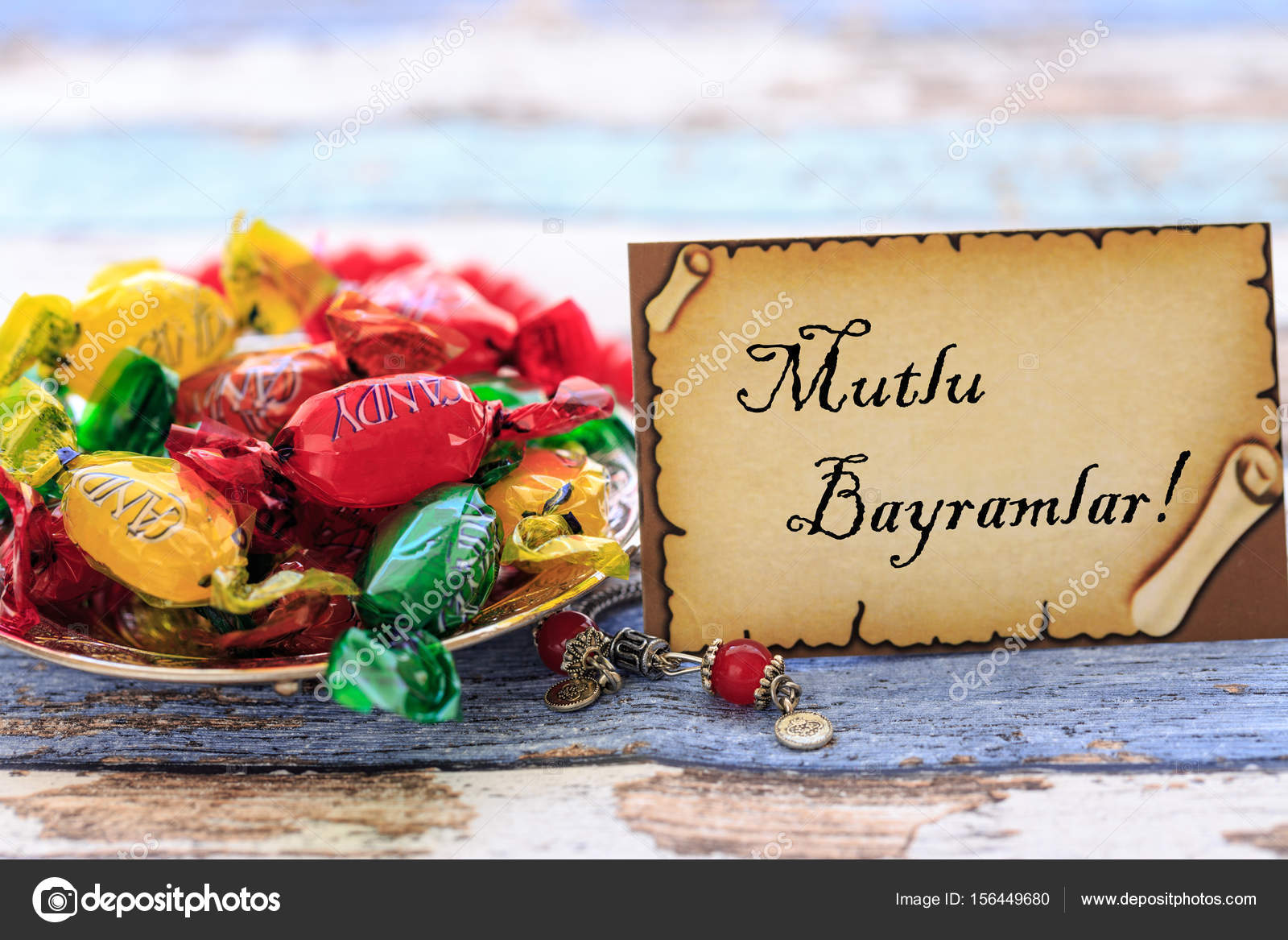 Eid Mubarak In Turkish On The Card With Colorful Candies On Table Stock Photo Image By C Muratani 156449680