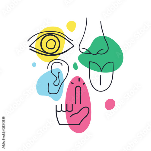 Human sense icon illustration. Five senses nose lips eye ear and hand. Vision hearing smell hearing touch.
