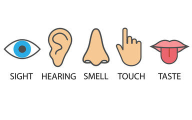 Smell Touch Hearing Taste And Sight Nose Lips Eye Ear And Hand Touch. Icon set of five human senses. Series of icons that represent the five senses.